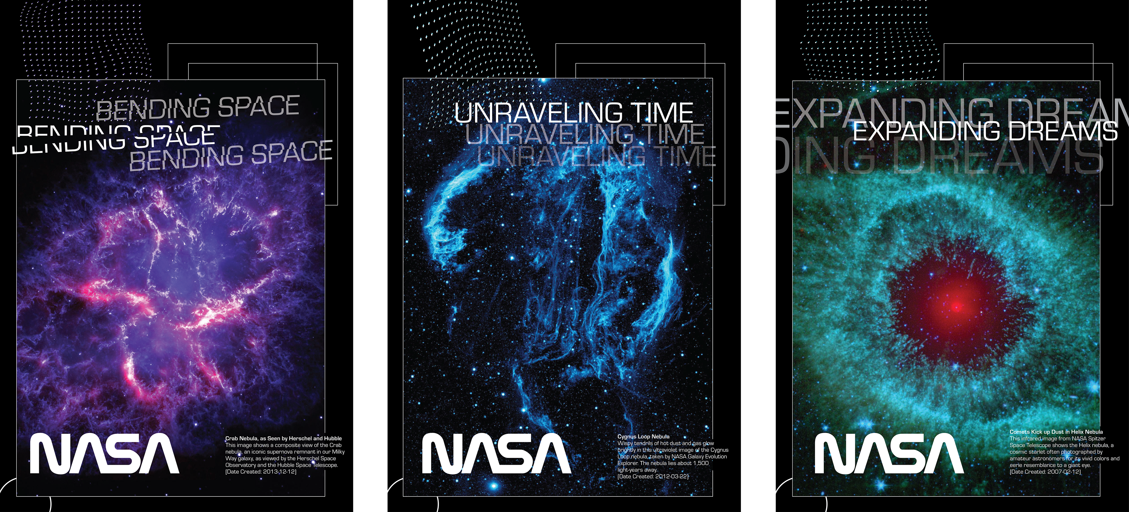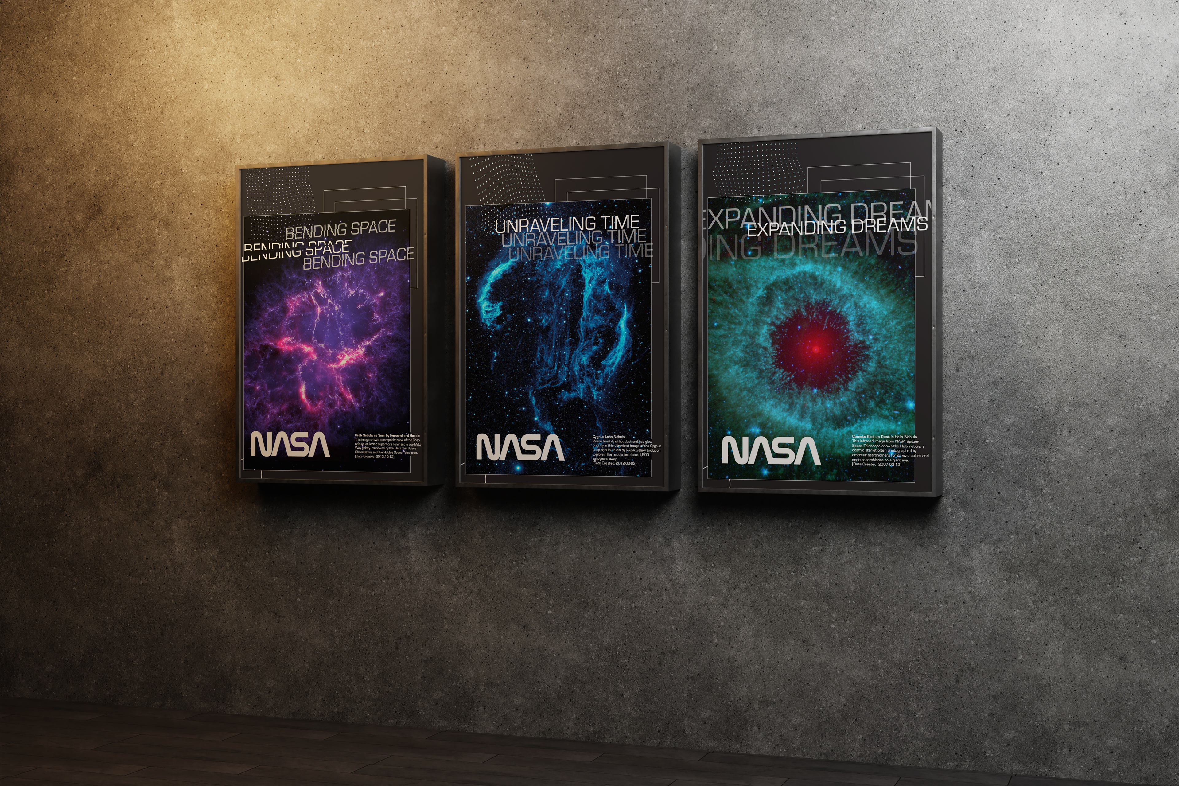 A set of collectible posters celebrating space exploration. Features authentic NASA imagery, bold minimal design, and experimental typography to capture the wonder of the cosmos.